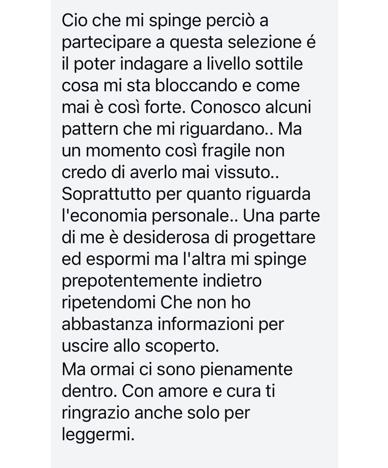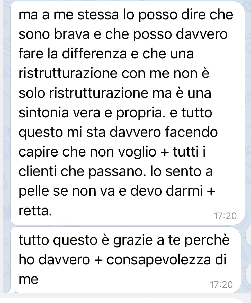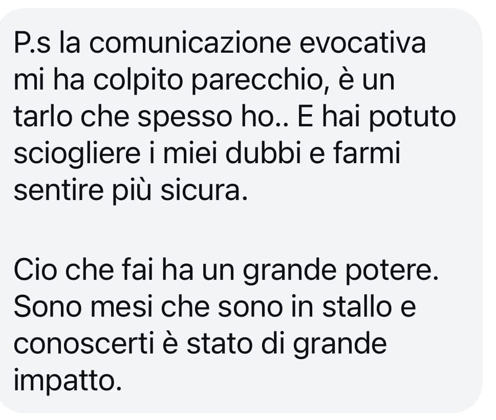"Il tuo progetto è grandioso! Nessuno propone un percorso così! Il miglior augurio che io possa fare ad una persona come te è questo: non perdere mai la gioia con cui affronti la vita. questo tuo talento ti rende preziosamente contagiosa!